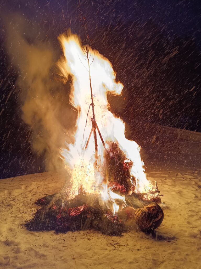 夕方から本格的な雪降りとなりましたが きょうは地区のドンド焼き。各家庭から持ち寄った正月飾りや神社札のお焚き上げ。