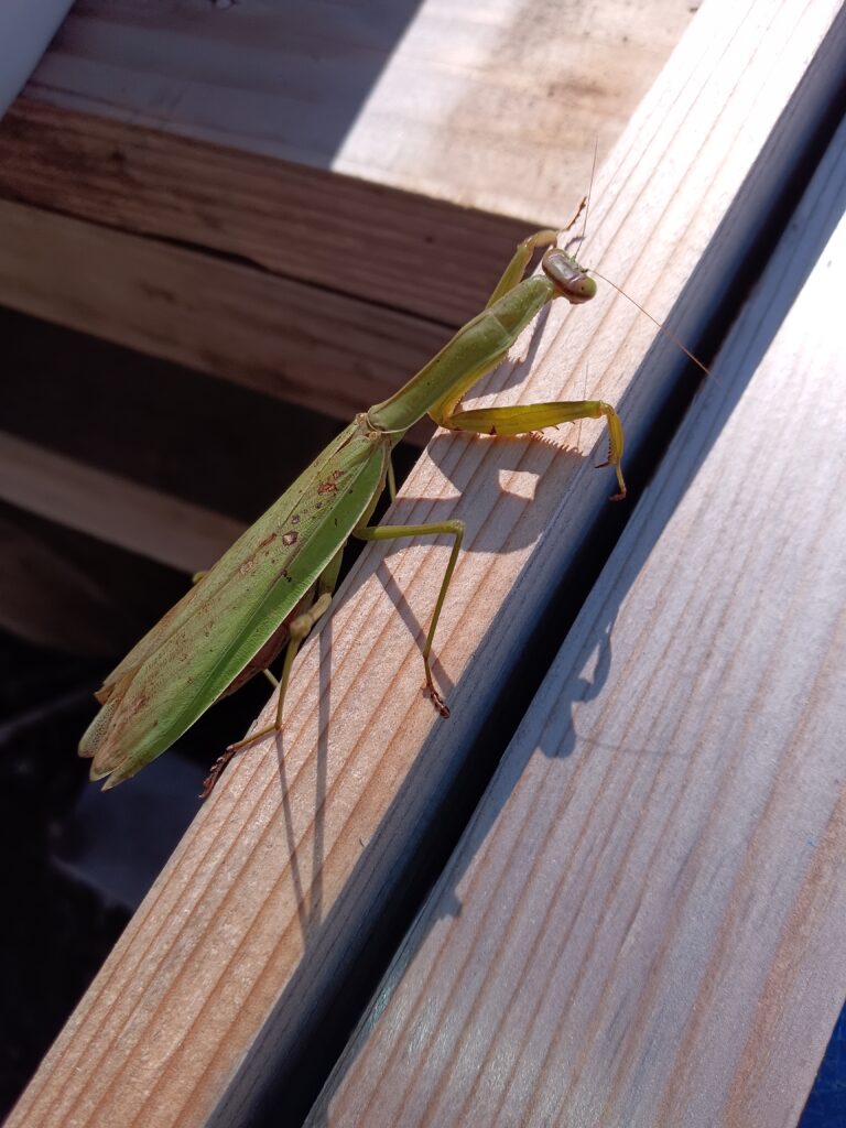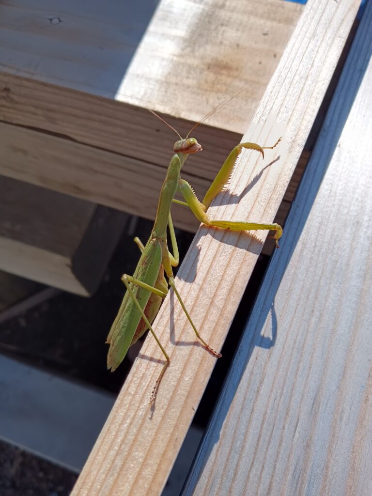 写真のカマキリ、2日前は窓の網戸の上端をもぞもぞしていたのが 今日は地べたから40cmほどの材木の上で何やら思案顔。