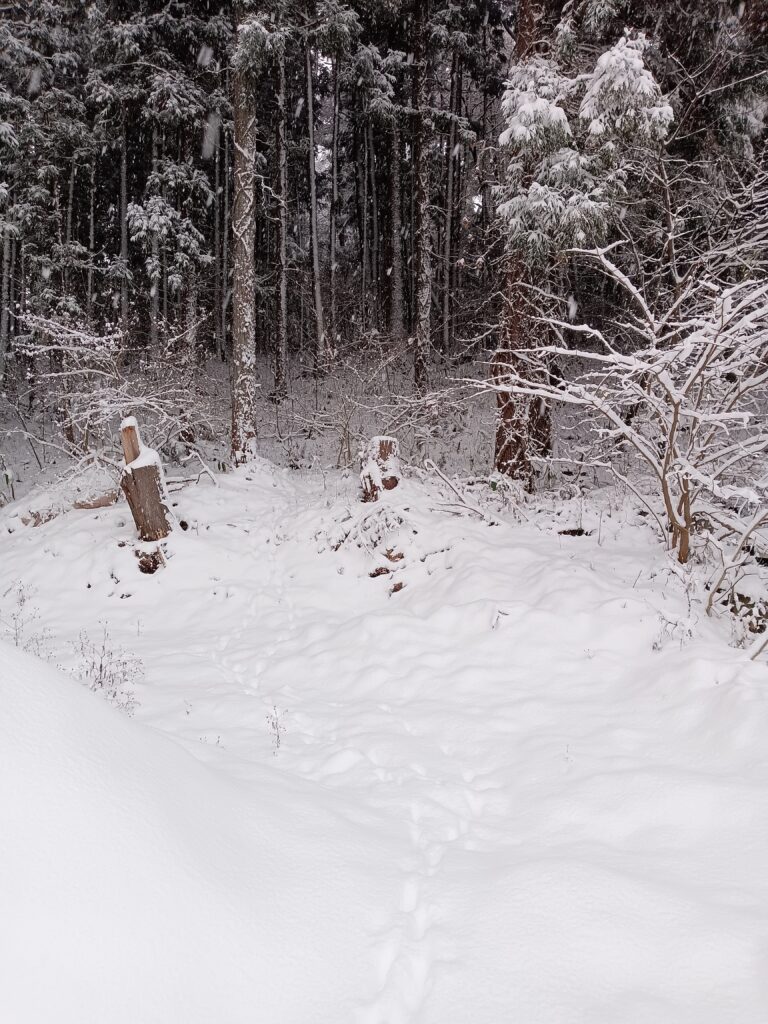 はっきり解るのはキツネかな、他にも数種類の足跡が林の中から出てきています。